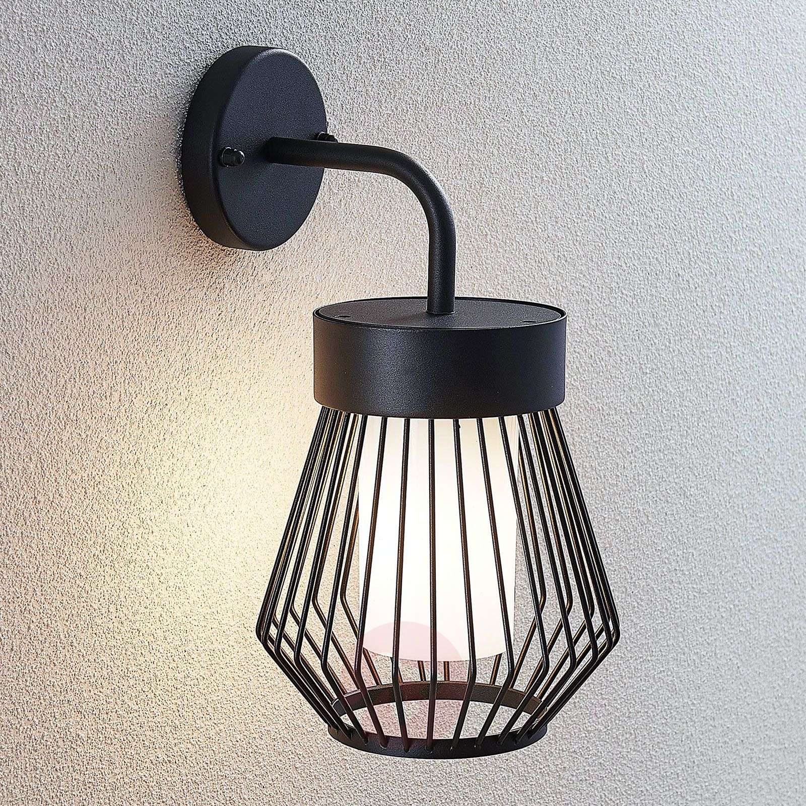Czarna lampa zewnętrzna Vajana z kloszem klatkowym Klosz tej lampy ściennej do użytku zewnętrznego jest w stylu klatki i dlatego przyciąga wzrok. Wewnątrz znajduje się również cylindryczny klosz wykonany z opalowo-białego poliwęglanu w celu zapewnienia wyjątkowo miękkiego i jednolitego oświetlenia na zewnątrz. Pod względem optycznym Vajana jest bardzo dekoracyjną lampą, będącą eleganckim dodatkiem na zewnątrz oraz emitującą miękkie światło do orientacji. Klasa efektywności energetycznej: A++