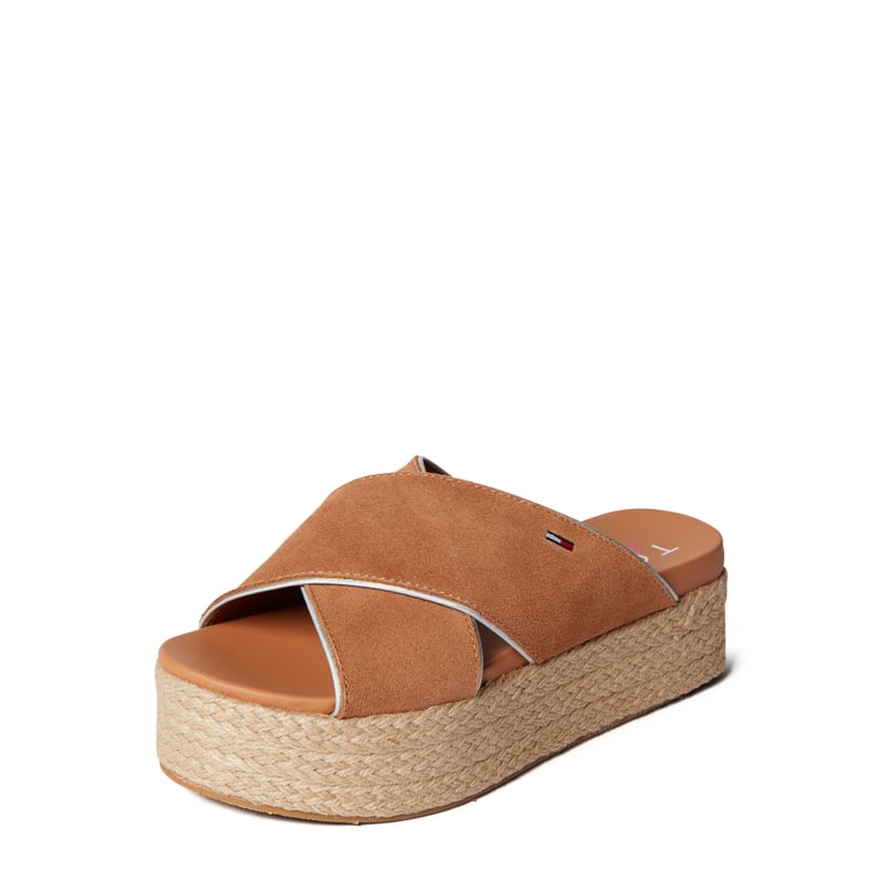 Klapki na platformie damskie Tommy Jeans, Mieszanka skóry, Zaokrąglony czubek, Imitacja weluru, Obszycie z łyka, Szerokie paski, Akcenty metaliczne, Detale z logo, Wysokość obcasa w rozmiarze 39: 6 cm, Wysokość cholewki: , Szerokość cholewki: