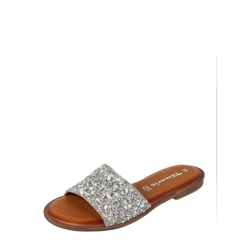 Klapki damskie Tamaris, Skóra naturalna, Kamienie stras, Szeroki pasek, Otwarty czubek, Wkładka ze skóry, Gumowa podeszwa, Wysokość podeszwy w rozmiarze 39: 1,5 cm