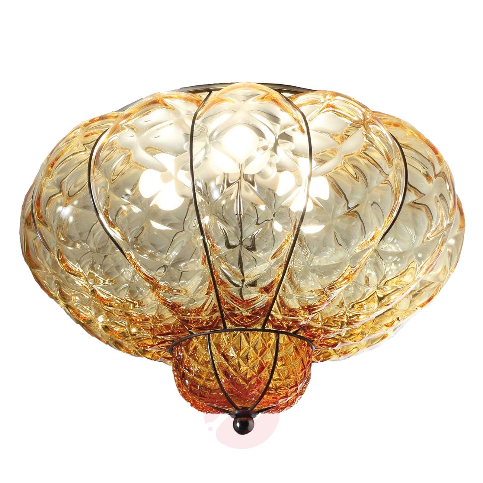 Lampa sufitowa dmuchana SULTANO ze szkła Murano rozjaśni wnętrza wspaniałym blaskiem Uwypuklający się delikatnie na zewnątrz szklany klosz lampy SULTANO osadzony jest w lekkiej metalowej oprawie i tworzy elegancką lampę, czarującą urokiem. Przezroczyste ścianki klosza o strukturalnej powierzchni są w odcieniu bursztynowym. Przepuszczają na zewnątrz jasne, łagodne światło, podkreślające przyjemną atmosferę. Lampa sufitowa SULTANO wpasuje się w różne style wnętrz i oczaruje miłośników włoskiego kunsztu dmuchania szkła. Lampy tego producenta wykonywane są we Włoszech ręcznie ze stali szlachetnej i szkła. Każdy wyrób jest produktem unikatowym o cechach indywidualnych. Możliwe różnice w kolorze materiałów są potwierdzeniem ręcznego wykonania i najwyższej jakości. Klasa efektywności energetycznej: A++