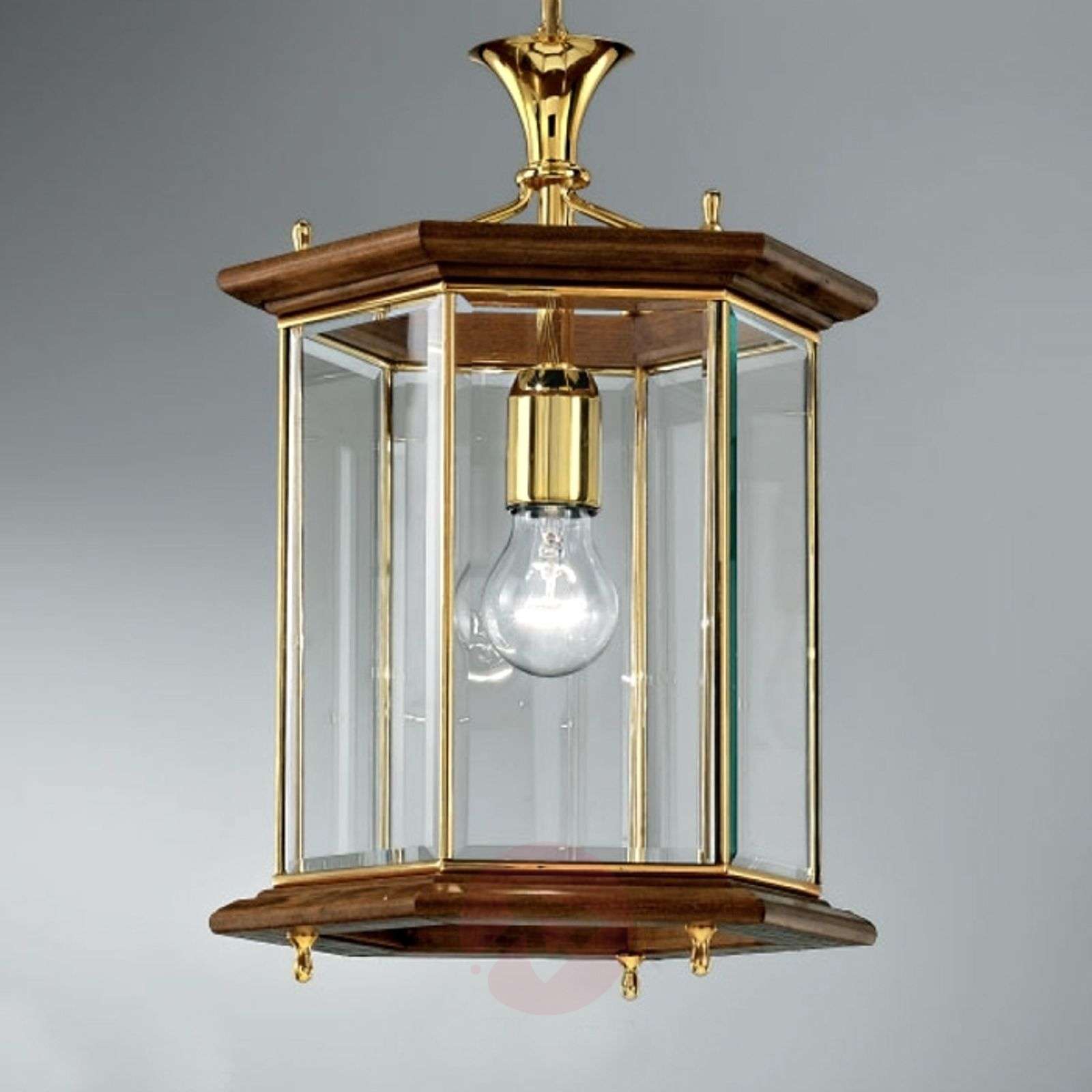 Elegancka lampa wisząca MONA ze złotą powierzchnią Lampa wisząca MONA jest wykonana ze stylowego połączenia materiałów. Brązowa, drewniana rama komponuje się tutaj z elementami metalowymi w złotym kolorze i przezroczystym szkłem. Przejrzysty, szklany klosz zapewnia równomierne i efektywne oświetlenie najróżniejszych pomieszczeń mieszkalnych. Klasyczna lampa wisząca MONA zwiesza się z sufitu na tworzącym optyczną całość łańcuchu. Klasa efektywności energetycznej: A++