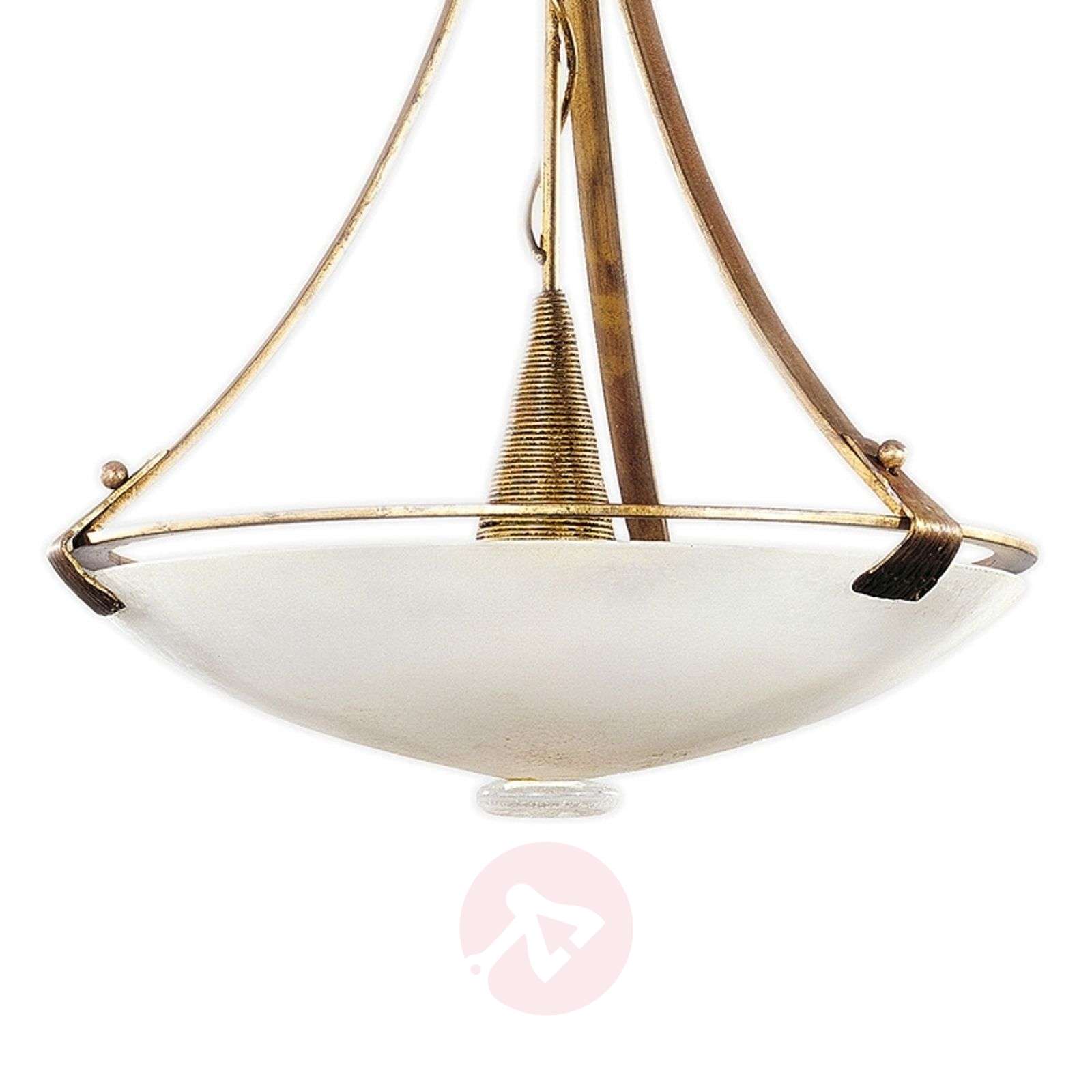 Lampa wisząca Tuscania w złotym kolorze, wykonana ręcznie Toskańska tradycja, technika i sztuka rzemieślnicza umożliwiły powstanie tej ekskluzywnej lampy wiszącej Tuscania w pięknym kształcie. Ta lampa wisząca nadaje wnętrzom śródziemnomorski urok, a jednocześnie dzięki białemu szklanemu kloszowi skierowanemu w stronę sufitu gwarantuje nastrojowe i łagodne światło. Metalowe elementy w złotym kolorze zostały wykonane i ozdobione ręcznie. Stylowa i klasycznie śródziemnomorska lampa wisząca, będąca ozdobnym obiektem wystroju wnętrza. Klasa efektywności energetycznej: A++