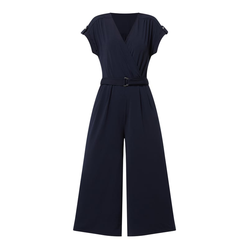 Kombinezon damski Betty Barclay, Mieszanka materiałów z dodatkiem streczu, Taliowany krój, Dekolt w serek w stylu kopertowym, Krótkie, ukośnie skrojone rękawy , Patki przy mankietach, Pasek w talii ze sprzączką typu D, Boczne wpuszczane kieszenie, Skrócona nogawka, Długość wewnętrzna nogawki w rozmiarze 36: 57 cm, Długość całkowita w rozmiarze 36: 124 cm