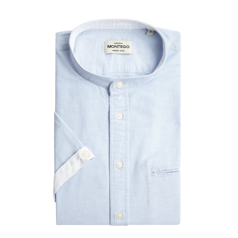 Koszula casualowa męska MONTEGO, Czysta bawełna, Krój slim fit, Oxford, Stójka, Krótkie rękawy, Nakładana listwa guzikowa , Lamowana kieszeń na wysokości piersi, Zakończenia rękawów z zakładką zapinaną na guzik , Długość tyłu w rozmiarze M: 77 cm, Szerokość ramion w rozmiarze M: 44 cm