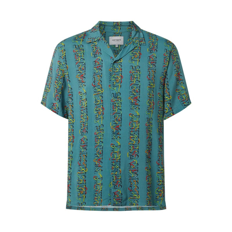 Koszula casualowa męska Carhartt Work In Progress, Czysta wiskoza, Krój loose fit, Wzór z logo , Kołnierzyk typu kent, Krótkie rękawy, Listwa guzikowa , Rozcięcia po bokach , Długość tyłu w rozmiarze M: 70 cm , Szerokość ramion w rozmiarze M: 49 cm
