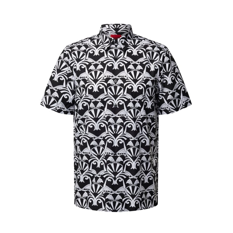 Koszula casualowa męska HUGO, Czysta bawełna, Krój straight fit, Model ‘Ebor’, Wzór na całej powierzchni, Kołnierzyk typu kent, Krótkie rękawy, Lekkie rozcięcia po bokach, Długość tyłu w rozmiarze M: 76 cm, Szerokość ramion w rozmiarze M: 45 cm, Długość rękawa w rozmiarze M: 26 cm