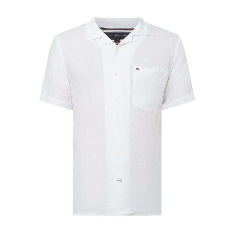 Koszula lniana męska Tommy Hilfiger, Czysty len , Krój regular fit, Wykładany kołnierz, Krótkie rękawy , Listwa guzikowa , Kieszeń na piersi , Wyhaftowane logo , Długość tyłu w rozmiarze M: 75,5 cm