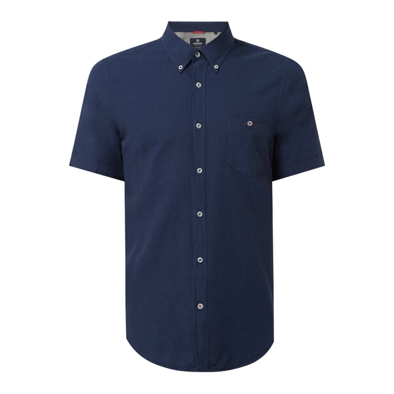 Koszula lniana męska LERROS, Mieszanka bawełny i lnu, Krój regular fit, Kołnierzyk typu button down, Krótkie rękawy , Listwa guzikowa, Kieszeń na piersi zapinana na guzik, Długość tyłu w rozmiarze M: 78 cm , Szerokość ramion w rozmiarze M: 45 cm