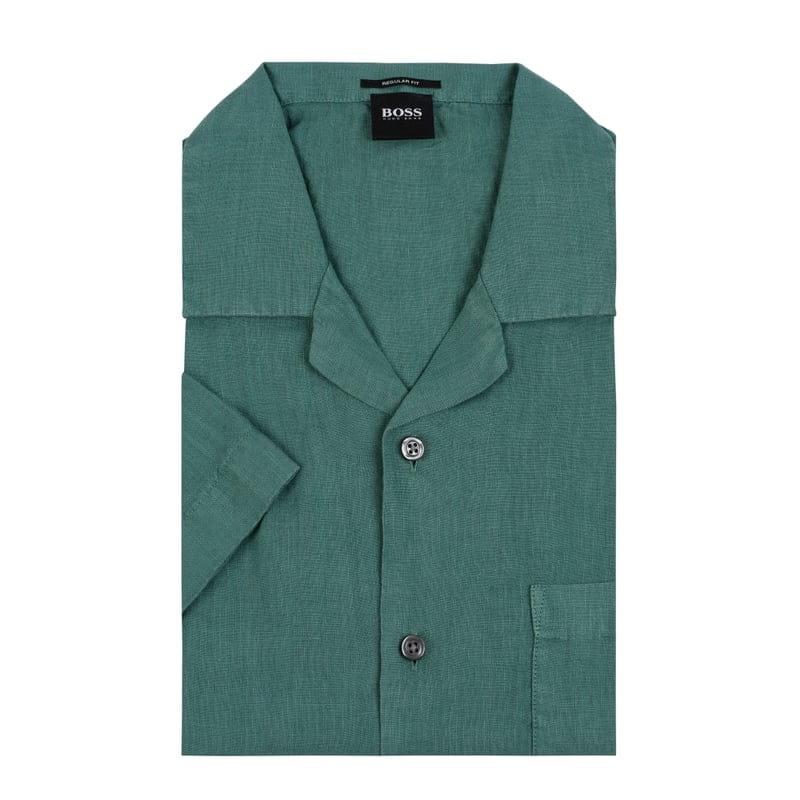 Koszula lniana męska BOSS, Czysty len, Krój slim fit, Kołnierzyk new kent , Krótkie rękawy, Listwa guzikowa , Kieszeń na piersi, Długość tyłu w rozmiarze M: 72,5 cm, Szerokość ramion w rozmiarze M: 47 cm