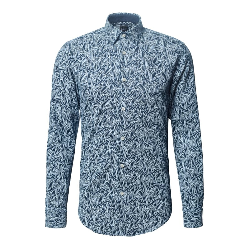 Koszula lniana męska BOSS, Mieszanka lnu, Krój slim fit, Wzór na całej powierzchni, Kołnierzyk typu kent, Listwa guzikowa, Mankiety z regulowaną szerokością, Długość tyłu w rozmiarze M: 76 cm, Szerokość ramion w rozmiarze M: 44 cm, Długość rękawa w rozmiarze M: 62 cm