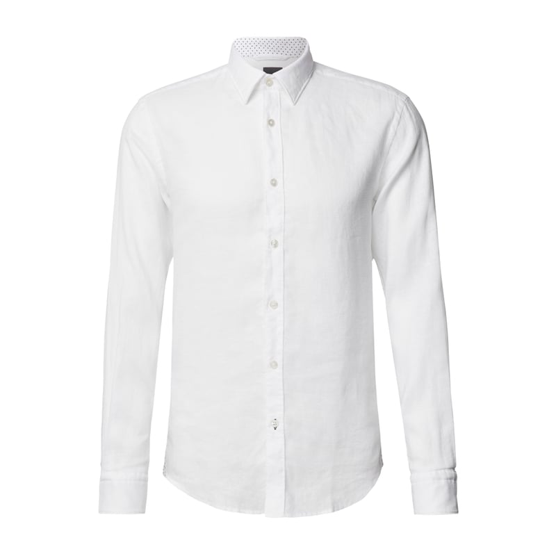 Koszula lniana męska BOSS, Mieszanka lnu , Krój slim fit, Listwa guzikowa, Mankiety z regulowaną szerokością, Detal z logo, Kołnierzyk typu kent, Długość tyłu w rozmiarze M: 78 cm, Szerokość ramion w rozmiarze M: 46 cm, Długość rękawa w rozmiarze M: 62 cm