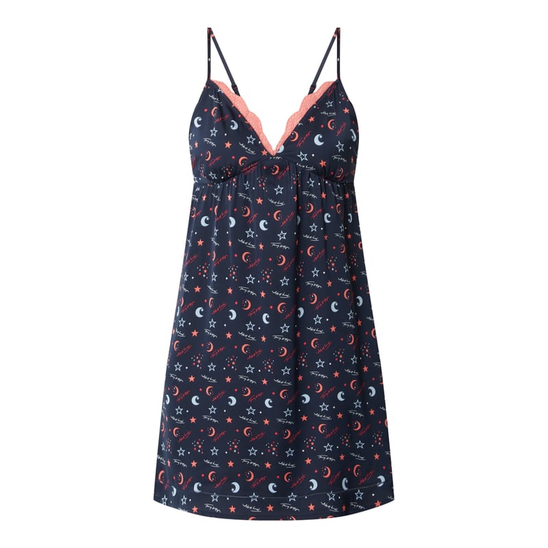 Koszula nocna damska Tommy Hilfiger , Satyna , Taliowany krój , Nadruk w gwiazdy , Dekolt w serek z ozdobną tasiemką , Cienkie ramiączka , Długość tyłu w rozmiarze S: 85 cm