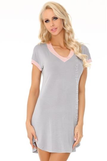 Sliczna szara koszulka z rozowym V-dekoltem w kropeczki.