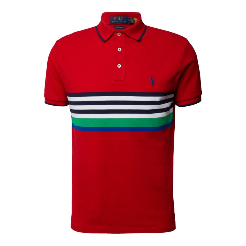 Koszulka polo męska Polo Ralph Lauren, Czysta bawełna, Krój custom slim fit, Kołnierzyk polo, Krótka listwa guzikowa, Wyhaftowane logo, Wstawki w kontrastowym kolorze, Zakończenia rękawów z prążkowanego ściągacza, Krótkie rozporki po bokach, Długość tyłu w rozmiarze M: 68 cm
