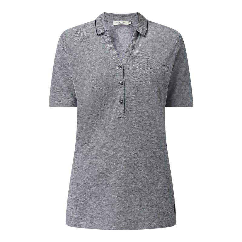 Koszulka polo damska Maerz, Czysta bawełna, Prosty krój, Delikatna tkana faktura, Kołnierzyk polo, Dekolt w serek, Krótka listwa guzikowa, Logo, Długość tyłu w rozmiarze 36: 65 cm