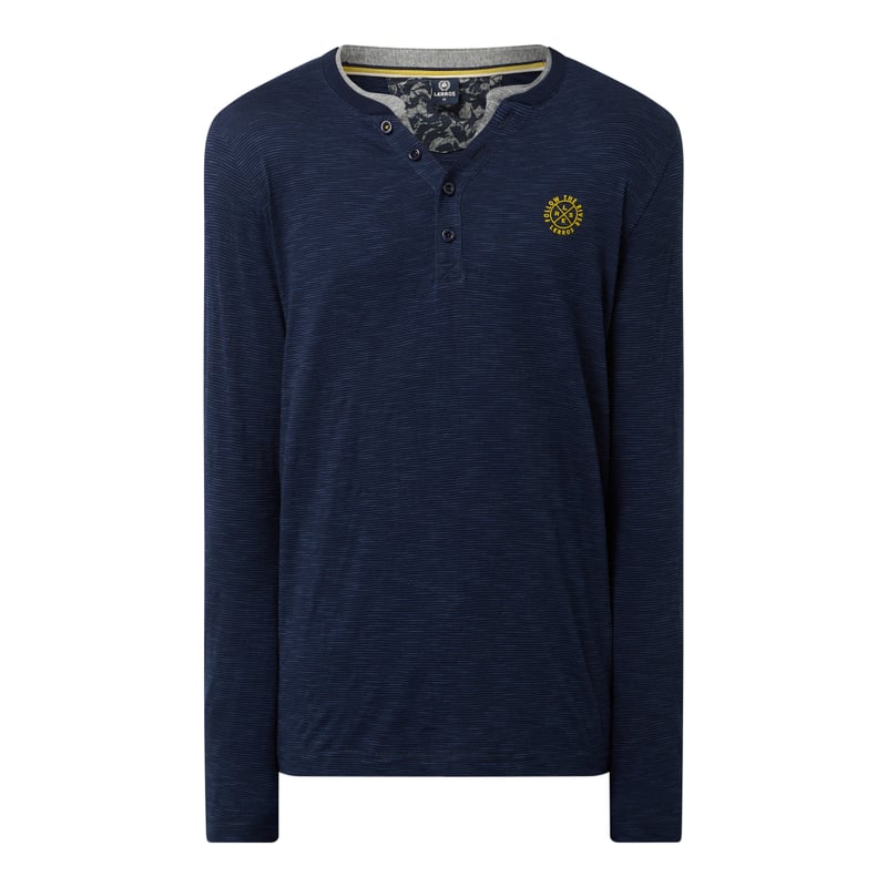 Koszulka serafino męska LERROS, Czysta bawełna , Prosty krój , Drobne paski, Dekolt z guzikami, Nadruk z logo na wysokości piersi , Długość tyłu w rozmiarze M: 69 cm , Długość rękawa w rozmiarze M: 65 cm
