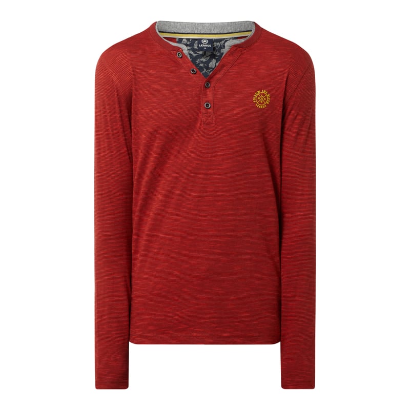 Koszulka serafino męska LERROS, Czysta bawełna , Prosty krój , Drobne paski, Dekolt z guzikami, Nadruk z logo na wysokości piersi , Długość tyłu w rozmiarze M: 69 cm , Długość rękawa w rozmiarze M: 65 cm