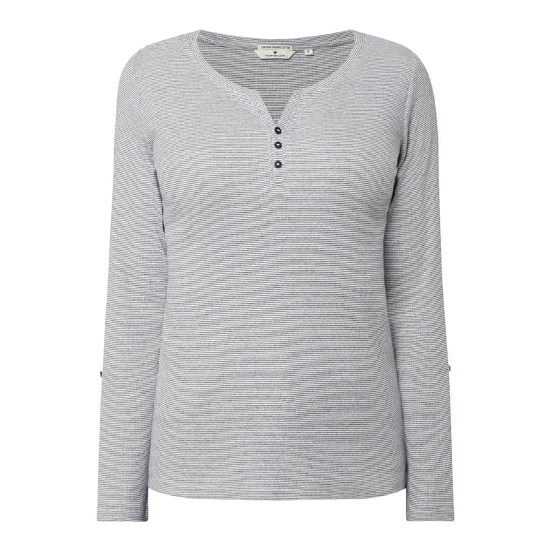 Koszulka serafino damska TOM TAILOR , Mieszanka bawełny i elastanu , Lekko taliowany krój , Wzór w paski , Okrągły dekolt z ozdobną listwą guzikową , Regulowana długość rękawa , Długość tyłu w rozmiarze S: 57 cm, Długość rękawa w rozmiarze S: 58 cm