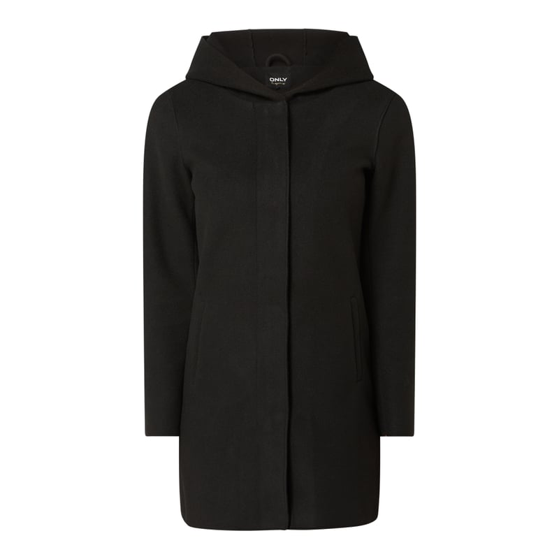Krótki płaszcz damski ONLY, Miękki materiał, Taliowany krój, Kaptur, Zamek błyskawiczny z plisą zapinaną na zatrzaski, Kieszenie z wypustkami, Długość tyłu w rozmiarze S: 78,5 cm, Szerokość ramion w rozmiarze S: 37 cm, Długość rękawa w rozmiarze S: 60 cm