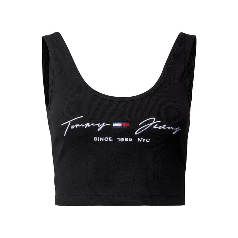 Top krótki damski Tommy Jeans, Mieszanka bawełny i elastanu, Dopasowany fason, Wyhaftowane logo w kontrastowym kolorze, Dekolt w łódkę, Drobne prążkowanie, Długość tyłu w rozmiarze S: 14 cm