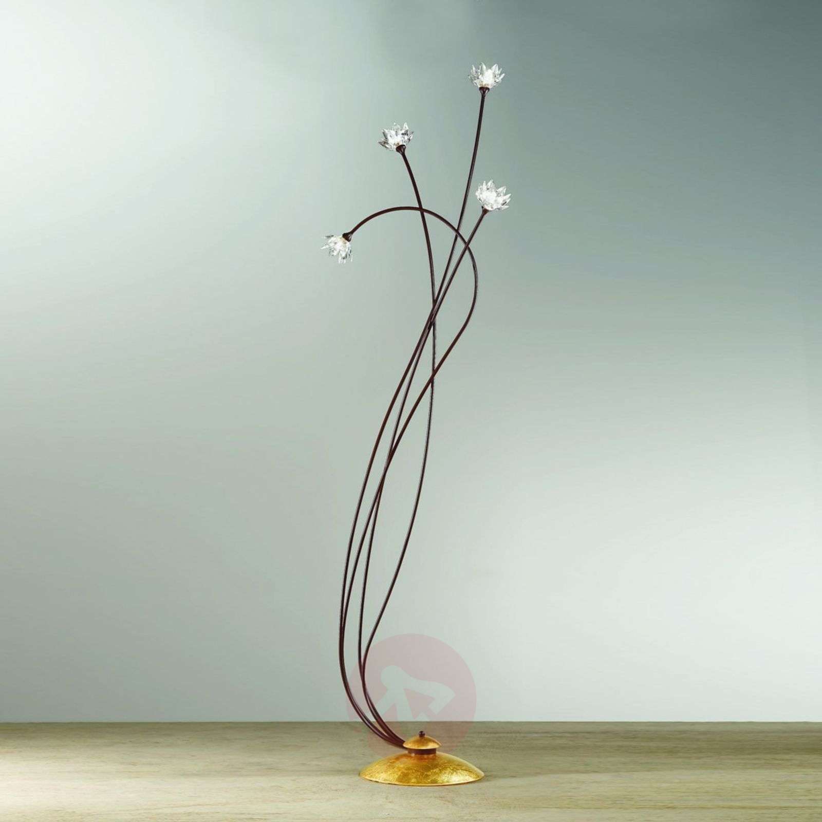 Dekoracyjne kryształowe kwiaty zdobią lampę stojącą Fiorella Fiorella jest atrakcyjnym obiektem przyciągającym wzrok dla wszystkich, którzy kochają to, co szczególne. Jej kwieciste kryształowe klosze emitują lśniące światło, które odbija podstawa pokryta folią ze złota. Porywająco wygięte ramiona są wykończone w kolorze antycznym rdzawym. Dzięki temu lampa stojąca Fiorella jest stylowym uzupełnieniem klasycznych, antycznych, ale także nowoczesnych stylów wyposażenia wnętrz. Klasa efektywności energetycznej: A++