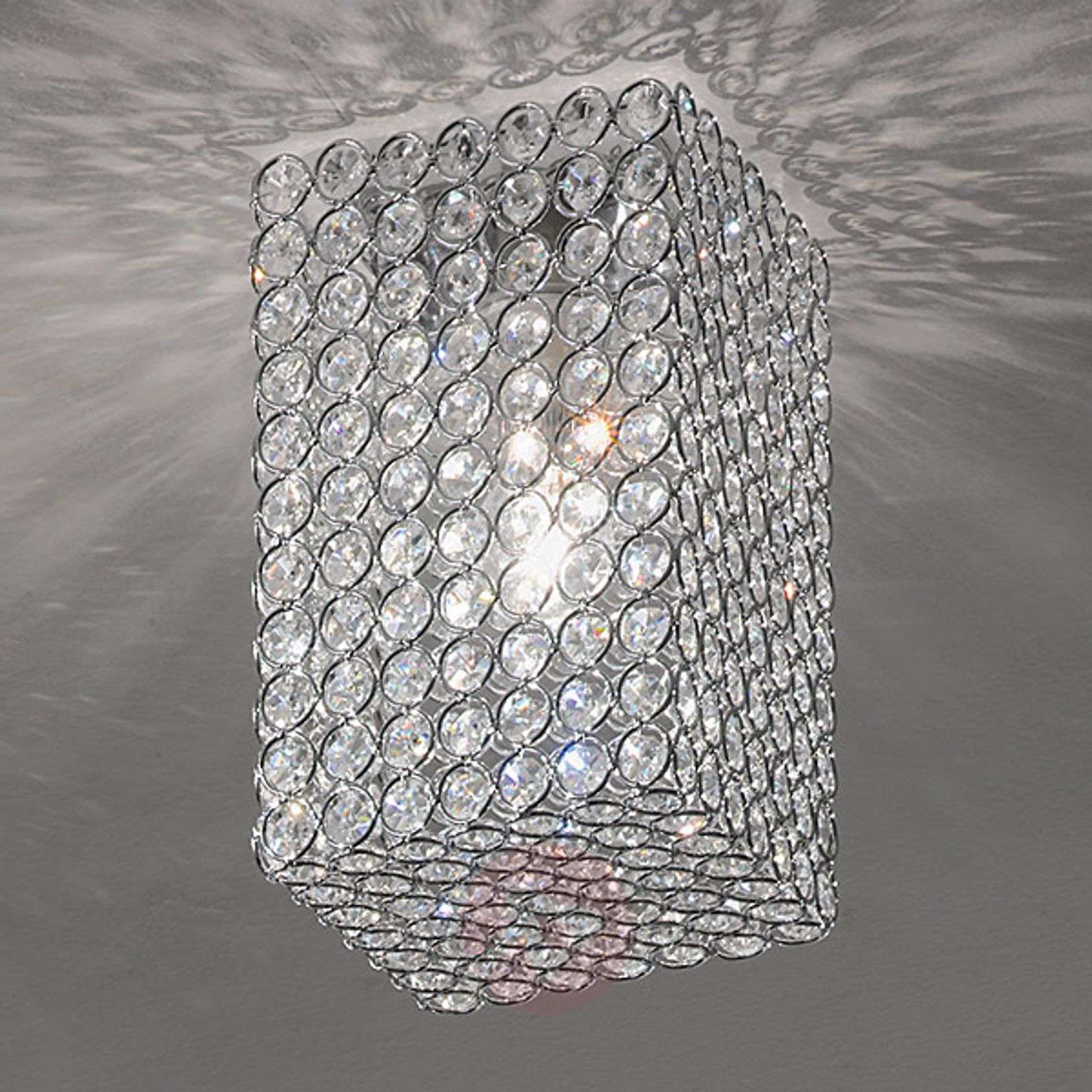 Migocząca lampa sufitowa AMAJA w kształcie prostopadłościanu Lampę sufitową AMAJA tworzą niezliczone kryształy K9 umieszczone w metalowych pierścieniach, które razem tworzą prostopadłościan. Emitowane przez umieszczoną wewnątrz żarówkę halogenową światło jest odbijane przez kryształy, dzięki czemu powstają piękne refleksy i efekty świetlne. AMAJA to połączenie wytworności klasycznych kryształowych lamp z nowoczesną formą, dzięki czemu odnajdzie się w różnych wnętrzach. Klasa efektywności energetycznej: A++