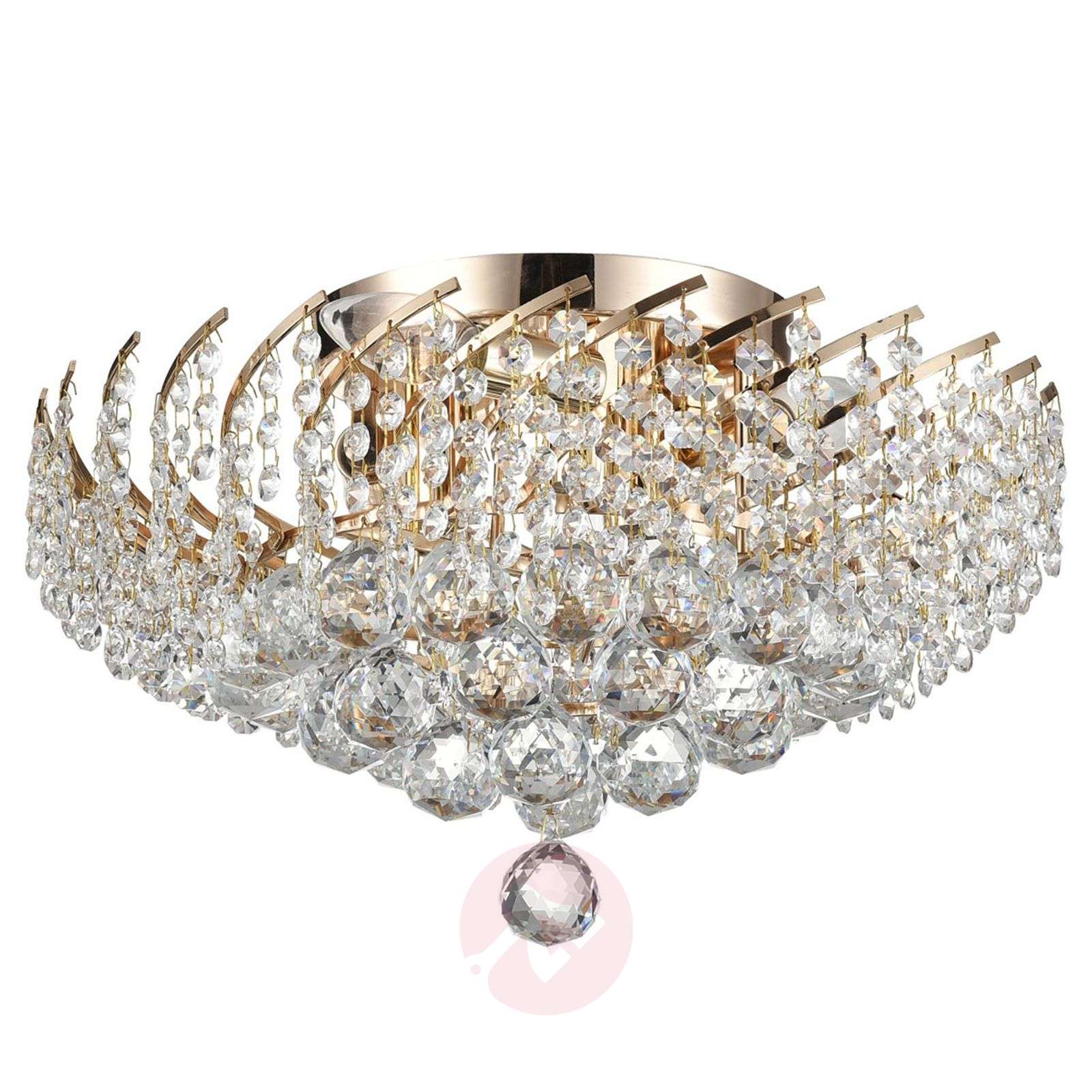 Lampa sufitowa Karolina z ekstrawagancko dużymi kryształami Lampa sufitowa Karolina to atrakcja wizualna do każdego eleganckiego mieszkania. Posiada bogate zdobienia z kryształów. Wiele z nich ma znaczne rozmiary i przyciąga wzrok nawet wtedy, gdy lampa wisząca nie jest włączona. Po włączeniu oświetlenia światło nadaje łagodny blask złotemu wykończeniu metalowej ramy, a w połączeniu z kryształami tworzy cudowne refleksy świetlne. Karolina – prawdziwa rozkosz dla oka. Klasa efektywności energetycznej: A++