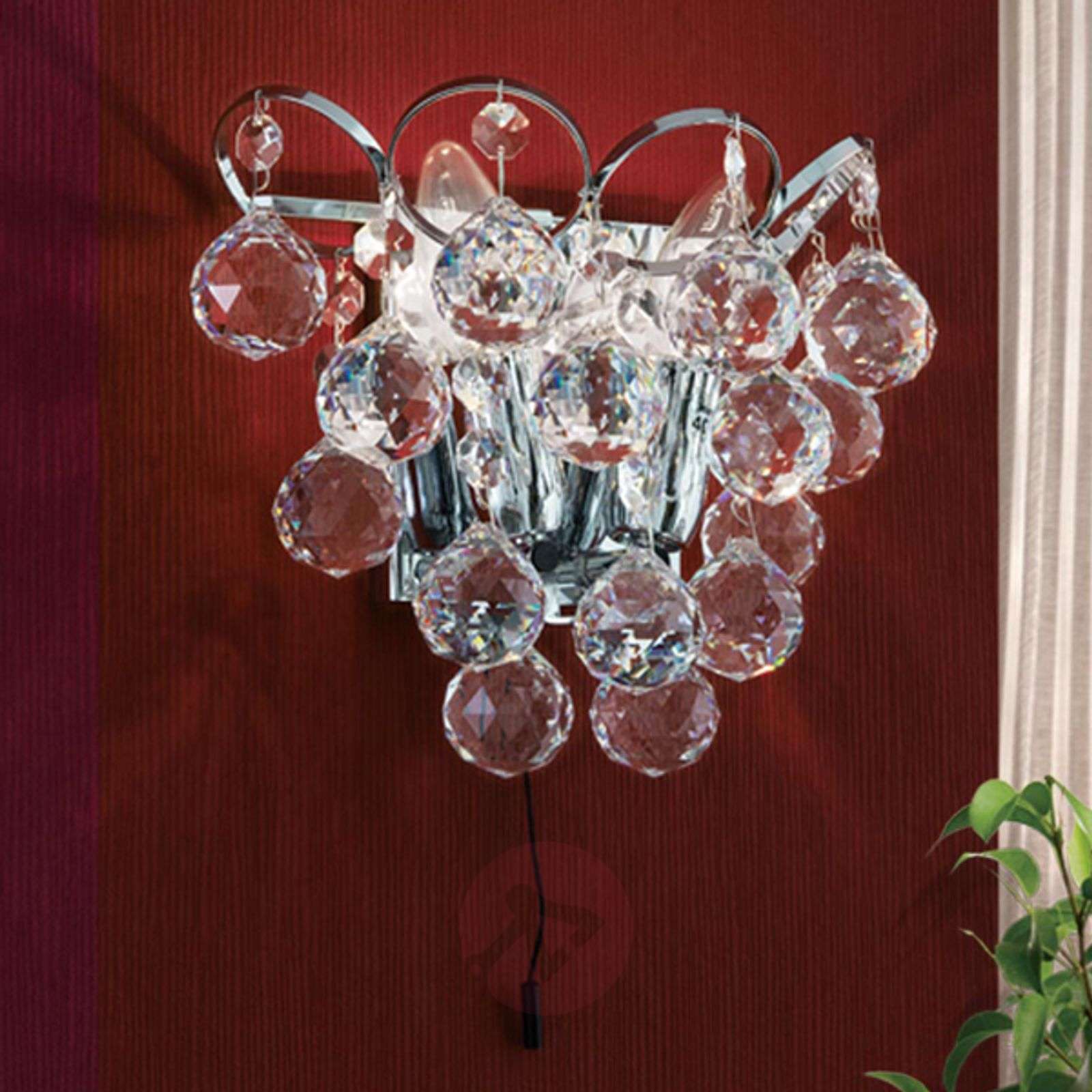 Kinkiet Auguste w kształcie winogrona, z kryształami Asfour Z chromowanej mosiężnej podstawy lampy Auguste zwisają liczne kryształki ze szkła ołowiowego (Asfour), które w połączeniu z korpusem tworzą swego rodzaju gronko. Za nimi ukryte są dwa źródła światła E14 o kształcie świeczki, zapewniające efekty świetlne po włączeniu lampy. Wówczas w kryształkach dochodzi do niezliczonych załamań światła, rozpraszanych po całym wnętrzu. Najlepsze materiały i najwyższej jakości ręczna produkcja są gwarancją wyjątkowo długiej żywotności oraz wysokich standardów spełnianych przez kinkiet Auguste oraz pozostałe lampy z tej serii. Lampy klasy premium tego producenta są produkowane w Austrii. Klasa efektywności energetycznej: A++