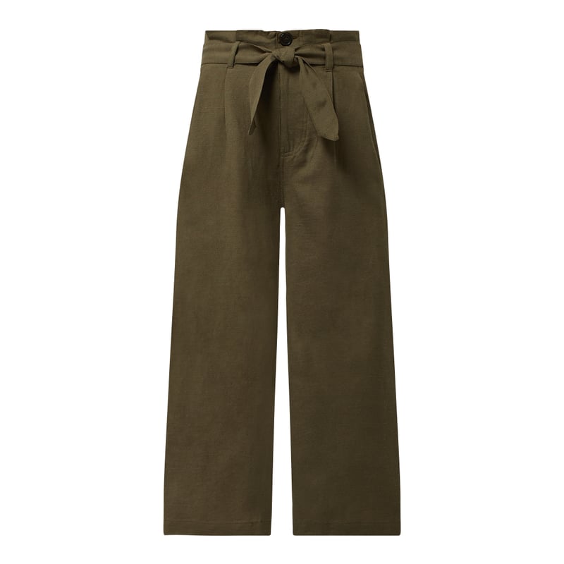 Kuloty damskie ONLY, Mieszanka wiskozy z dodatkiem bawełny i lnu , Zapięcie na guzik i zamek błyskawiczny , Szeroki, skrócony krój, Wiązany pasek typu paperbag w talii, Wpuszczane kieszenie w stylu francuskim, Zakładki w pasie, Szerokość w pasie w rozmiarze S/32: 76 cm