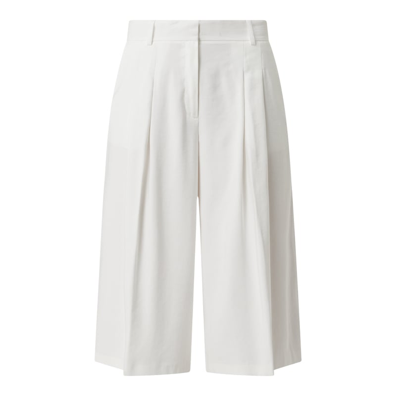 Kuloty damskie s.Oliver BLACK LABEL, Mieszanka wiskozy, Szeroka, skrócona nogawka, Zapięcie na haftkę, guzik i zamek błyskawiczny, Boczne wpuszczane kieszenie, Zakładki w pasie, Ozdobne wypustki z tyłu, Długość wewnętrzna nogawki w rozmiarze 36: 48 cm, Szerokość w pasie w rozmiarze 36: 72 cm