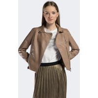 Wiosenna kurtkaKurtka damskatypu ramoneska wykonana z najwyższej jakości skóry ekologicznej, dodatkowo od wewnątrz posiada poliestrową podszewkę. Wykładany kołnierz został ozdobiony na końcach zatrzaskami.Klasyczny fason kurtki urozmaica asymetryczny suwak. Model występuje w trzech ponadczasowych odcieniach: beżowym, bordowymorazczarnym.Nasza rada:metalowe elementy typu klamry, suwaki i zatrzaski wprowadzą do kreacji nutęrockowego klimatu. modelzapinany na suwak; wykończony wykładanym kołnierzem; posiada dwie kieszenie zewnętrzne zapinane na suwak.
