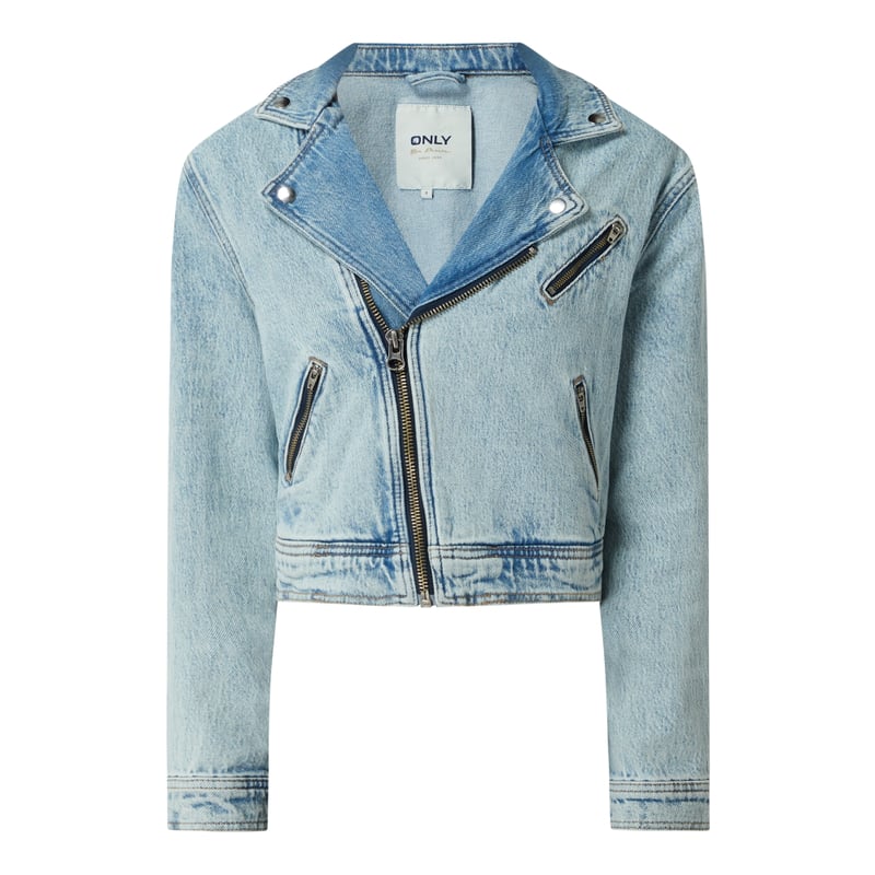 Kurtka jeansowa damska ONLY , Mieszanka bawełny i elastanu , Krój krótki , Styl Biker , Szeroki kołnierz z klapami , Asymetryczny zamek błyskawiczny , Kieszenie zapinane na zamek błyskawiczny , Ozdobny zamek błyskawiczny , Długość tyłu w rozmiarze S: 48 cm , Szerokość ramion w rozmiarze S: 43, 5 cm , Długość rękawa w rozmiarze S: 57 cm