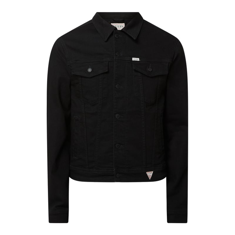Kurtka jeansowa męska GUESS, Mieszanka bawełny z dodatkiem streczu, Prosty krój, Wykładany kołnierz, Listwa guzikowa, Kieszenie z patką na guzik, Wpuszczane kieszenie, Mankiety zapinane na guzik, Logo, Długość tyłu w rozmiarze M: 62 cm , Szerokość ramion w rozmiarze M: 47 cm , Długość rękawa w rozmiarze M: 68 cm