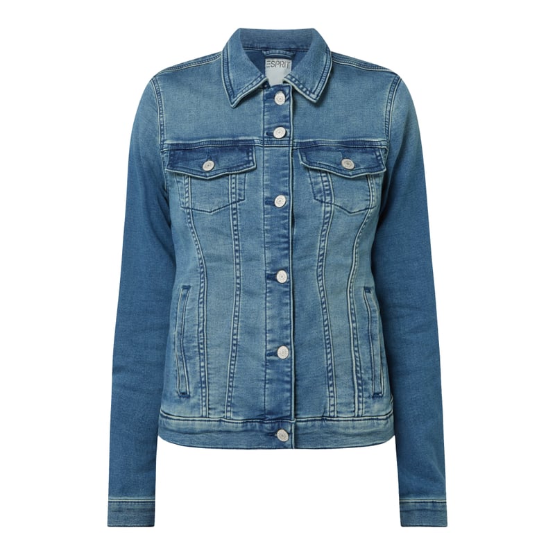 Kurtka jeansowa damska Esprit, Mieszanka bawełny ekologicznej z dodatkiem streczu , Taliowany krój, Dzianina dresowa stylizowana na denim, Wykładany kołnierz , Listwa guzikowa , Kieszenie z patką zapinane na guziki i wpuszczane kieszenie, Długość tyłu w rozmiarze 36: 53 cm , Szerokość ramion w rozmiarze 36: 40 cm , Długość rękawa w rozmiarze 36: 63 cm