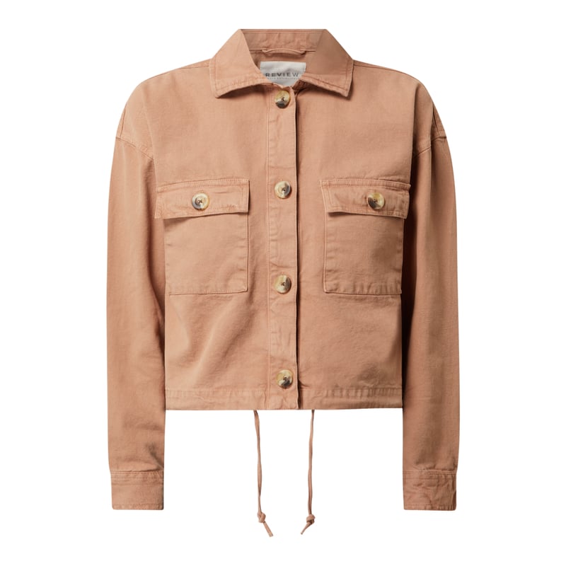 Kurtka damska REVIEW , Czysta bawełna , Krój krótki , Wykładany kołnierz , Listwa guzikowa , Obniżone ramiona , Długie rękawy , Kieszenie z patką na guzik, Tunel na dole , Długość tyłu w rozmiarze S: 49 cm