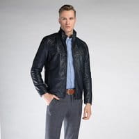Skórzana kurtka męskaKrótka kurtka o lekko dopasowanym kroju powstała z najlepszej jakości, miękkiej skóry owczej i posiadasatynową podszewkę.Prosty model został uatrakcyjniony grafitowymi elementami, przeszyciami na wysokości klatki piersiowej oraz na rękawach.Kurtka jest wyposażona w wiele kieszeni, dzięki którym portfel, klucze czy telefon komórkowy, będą zawsze pod ręką. Do wyboru są dwa nieprzemijające w modzie odcienie (granatowy oraz ciemnobrązowy).Nasza rada: stójkazamiast kołnierza nadaje kurtce bardziej nowoczesnego charakteru. zapinana na suwak; fason wykończony stójką; wykonana ze skóry naturalnej; posiada dwie otwarte kieszenie zewnętrzne; dwie wewnętrzne kieszenie, w tym jedna zamykana na suwak.