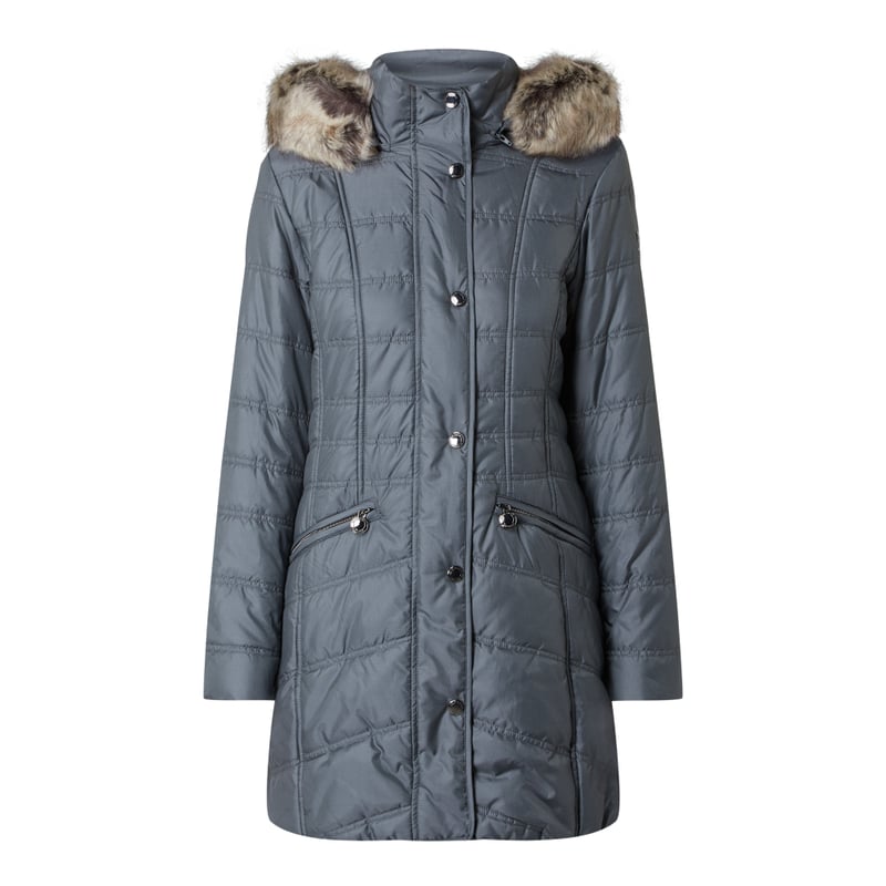 Kurtka pikowana damska Betty Barclay, Wytrzymały materiał, Taliowany krój, Stójka z odpinanym kapturem, Odpinane sztuczne futro, Zamek błyskawiczny z plisą zapinaną na zatrzaski, Kieszenie zapinane na zamek błyskawiczny, Logo, Watowanie, Długość tyłu w rozmiarze 36: 83 cm, Szerokość ramion w rozmiarze 36: 41 cm, Długość rękawa w rozmiarze 36: 63 cm