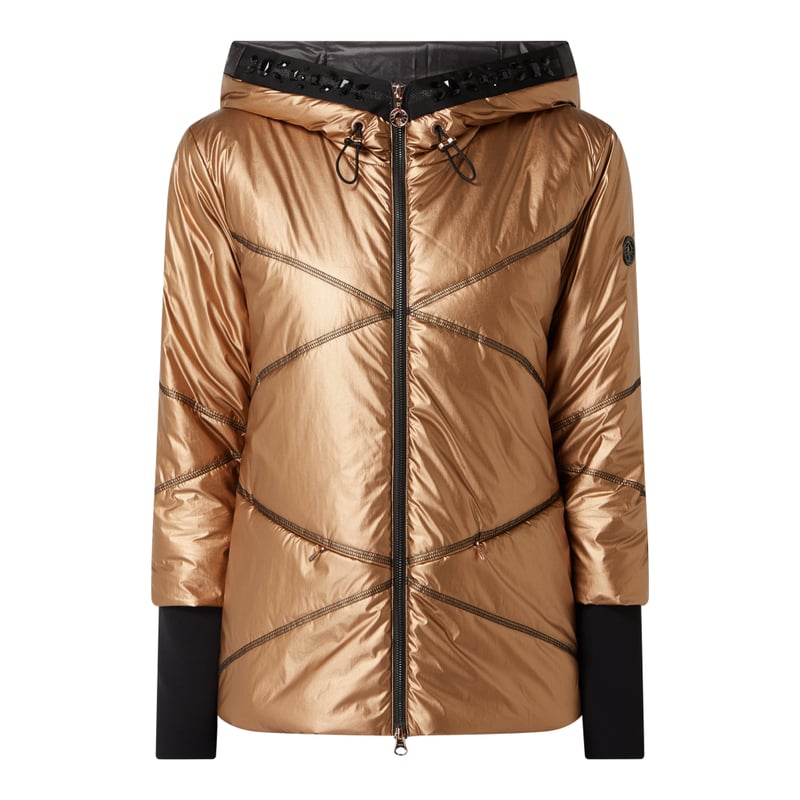 Kurtka pikowana damska SPORTALM, Wytrzymały materiał, Taliowany krój, Metaliczny materiał, Kaptur z tunelem i kamieniami stras, Rękaw o dł. 3/4, Zamek błyskawiczny dwustronny, Kieszenie z wszytym zamkiem błyskawicznym, Tunel z tyłu, Watowanie, Długość tyłu w rozmiarze 36: 64 cm, Szerokość ramion w rozmiarze 36: 42 cm