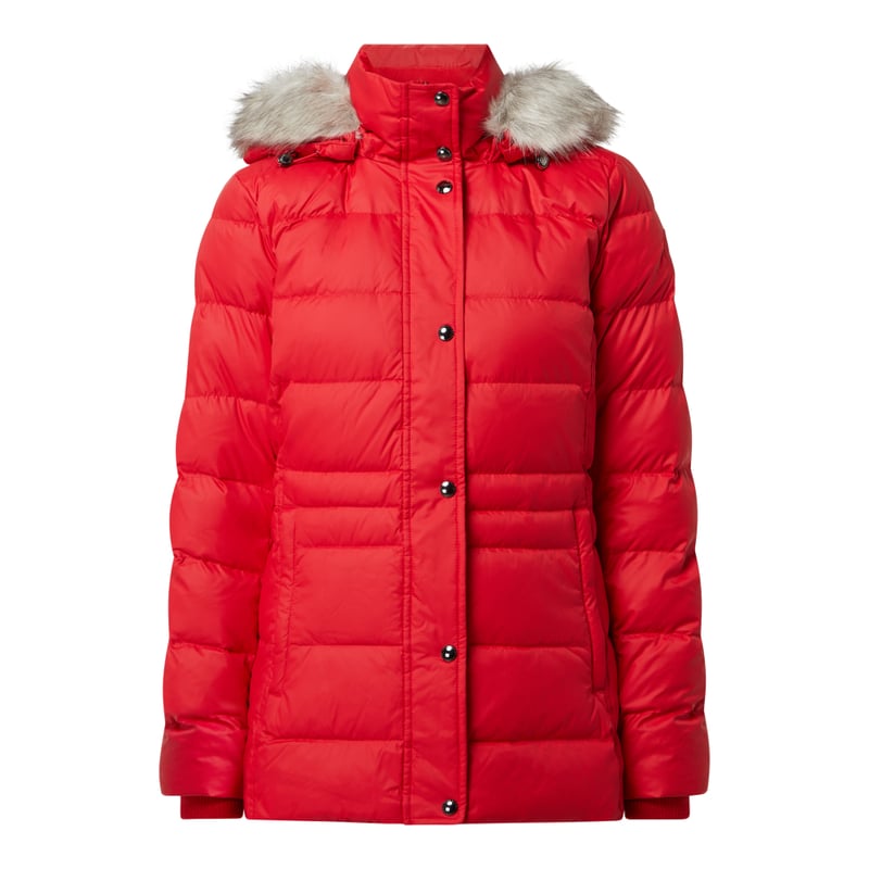 Kurtka puchowa damska Tommy Hilfiger, Wytrzymały materiał , Prosty krój , Stójka, Odpinany, regulowany kaptur z odpinanym sztucznym futrem, Kryty zamek błyskawiczny z plisą zapinaną na zatrzaski, Kieszenie z wypustkami, Dodatkowe mankiety, Detal z logo, Pikowanie, Wypełnienie puchem i pierzem, Długość tyłu w rozmiarze S: 70 cm, Szerokość ramion w rozmiarze S: 40 cm, Długość rękawa w rozmiarze S: 62 cm