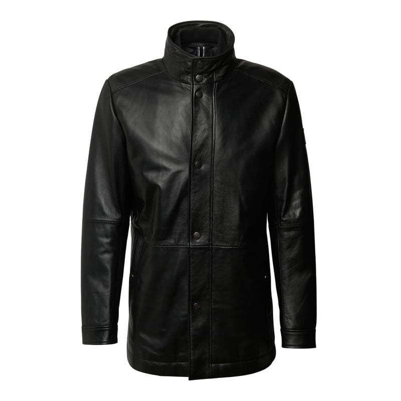 Kurtka skórzana męska BOSS, Skóra naturalna, Prosty krój, Stójka, Listwa z zatrzaskami, Wstawka z zamkiem błyskawicznym, Wpuszczane kieszenie zapinane na zatrzask, Naszywka z logo, Długość tyłu w rozmiarze 50: 80 cm, Szerokość ramion w rozmiarze 50: 49 cm, Szerokość klatki piersiowej: 59 cm, Długość rękawów: 65 cm