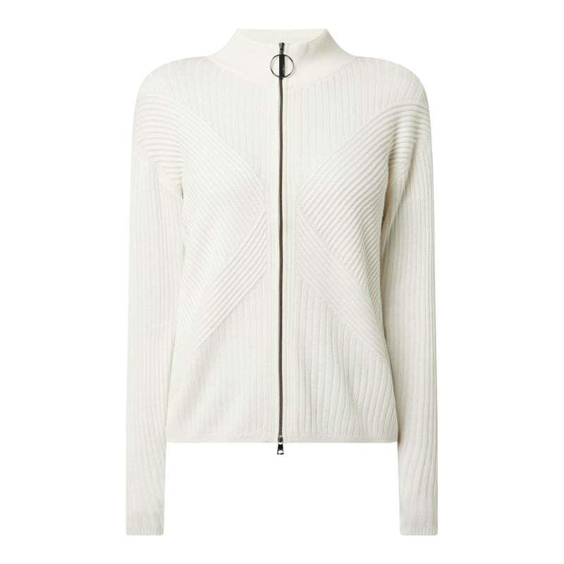 Kurtka z dzianiny damska Marc Cain Sports, Mieszanka wełny z domieszką kaszmiru , Taliowany krój, Prążkowana faktura , Stójka , Zamek błyskawiczny dwustronny , Obniżone ramiona , Długie rękawy , Pasek w kontrastowym kolorze z tyłu , Długość tyłu w rozmiarze 36: 55,5 cm , Długość rękawa w rozmiarze 36: 57,5 cm