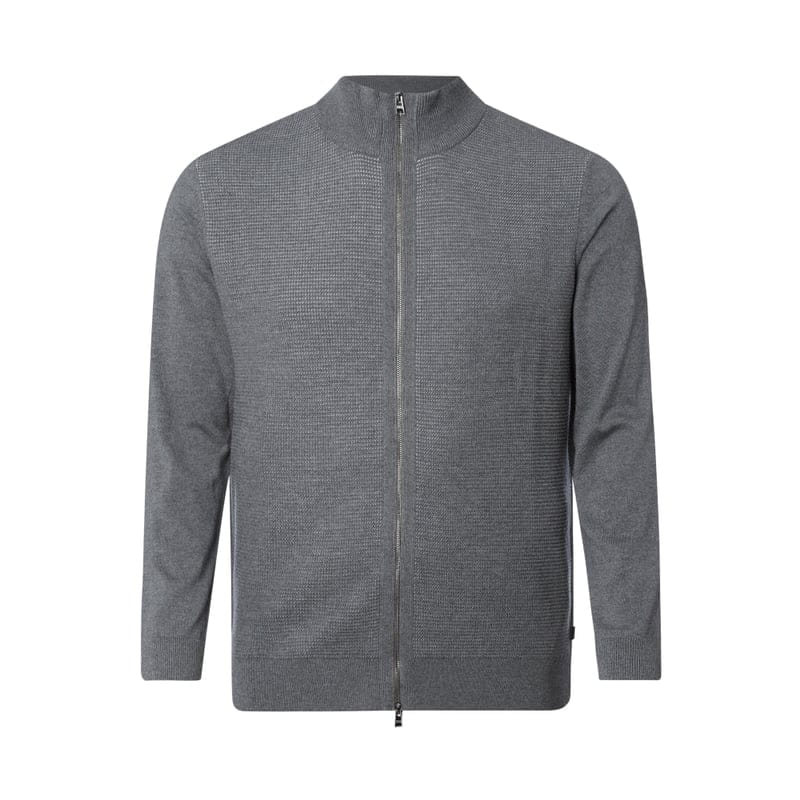 Kurtka z dzianiny męska BOSS , Czysta żywa wełna , Prosty krój , Oczka różnej wielkości , Stójka, Zamek błyskawiczny , Prążkowane wykończenia, Długość tyłu w rozmiarze XXL: 77 cm, Długość rękawa w rozmiarze XXL: 69 cm