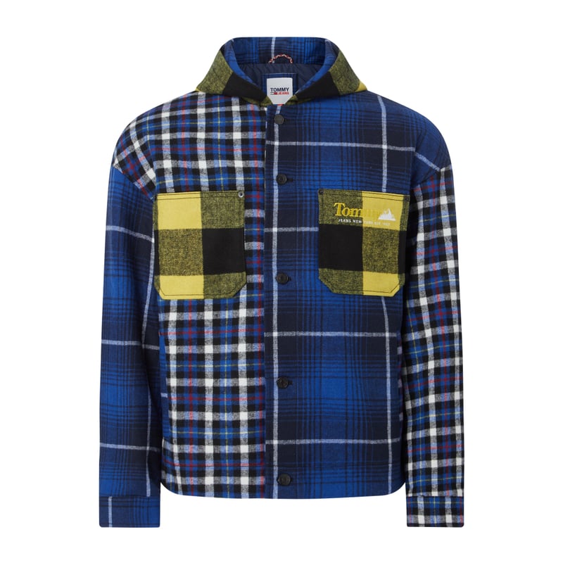 Kurtka męska Tommy Jeans, Mieszanka materiałów z wełną, wiskozą i streczem, Prosty krój, Flanela, Wzór w kratę , Kaptur , Obniżone ramiona , Listwa guzikowa , Kieszenie na piersi , Mankiety zapinane na guzik , Wpuszczane kieszenie, Logo, Watowanie , Długość tyłu w rozmiarze M: 71 cm