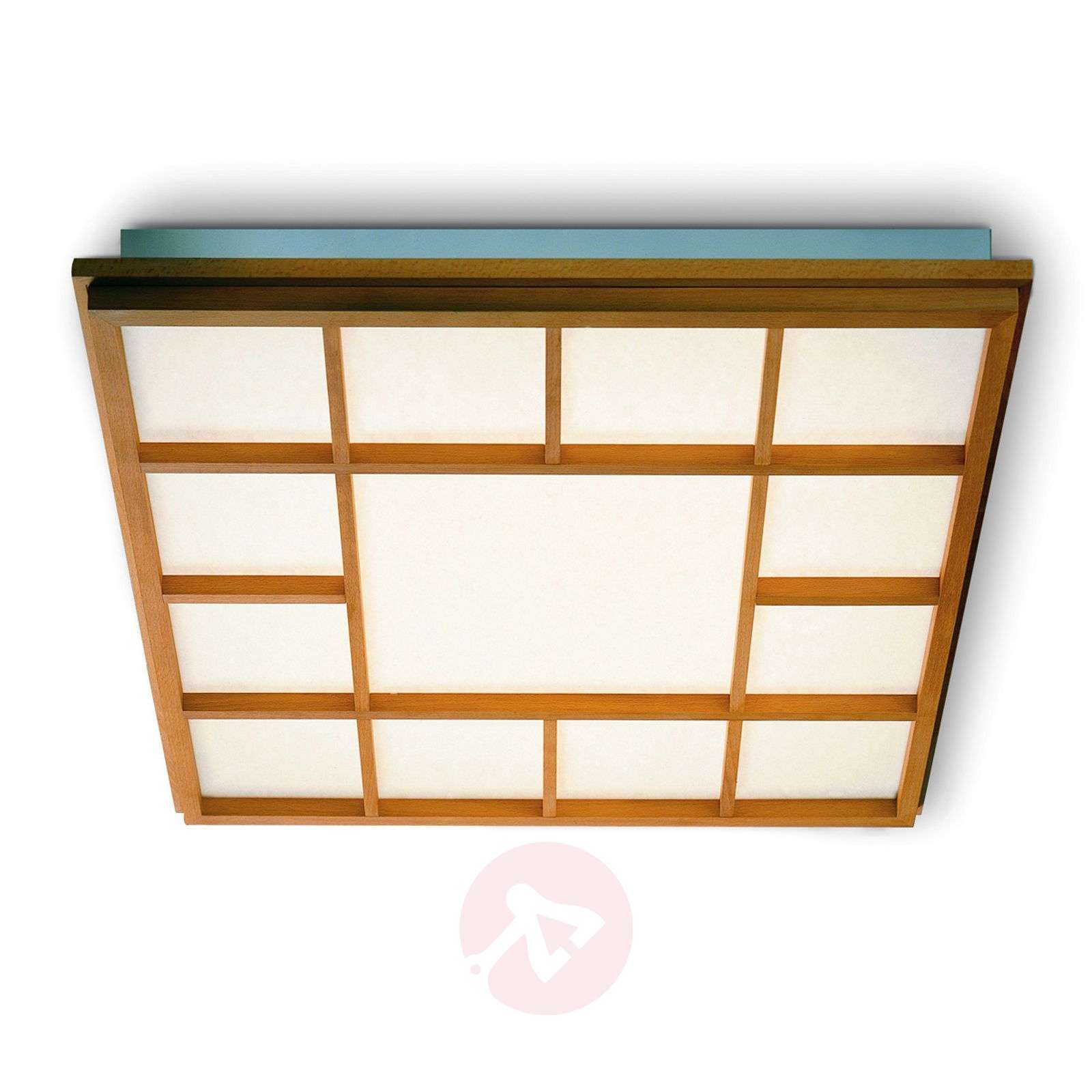 Lampa sufitowa LED KIOTO 13 z drewna bukowego w stylu japońskim Kwadratowa lampa sufitowa LED KIOTO 13 inspirowana jest tradycyjną japońską architekturą wnętrz. Oprawa z prawdziwego drewna bukowego oraz kosz z lunopalu wyraźnie nawiązują do ruchomych ekranów shōji stosowanych w japońskich wnętrzach do dzielenia pokoju. Duży klosz, który zdobi wzór w kwadraty w formie oprawy z drewna bukowego, rozprasza łagodne, przyjemne światło. - do montażu w formie lampy wpuszczanej lub natynkowej -ściemniana za pomocą zewnętrznego ściemniacza LEDIM lub TEDIM Marka dba o to, aby w czasie produkcji drewno nie straciło swego naturalnego piękna, dlatego do wykańczania powierzchni zamiast lakierów stosowane są oleje roślinne oraz naturalne woski. Lunopal to przypominające papier tworzywo sztuczne, które rozprasza przytulne światło i zachwyca również pod względem funkcjonalności. Jest odporne na promieniowanie UV, niełamliwe oraz nie żółknie i jest łatwe do czyszczenia. Równowaga ekologiczna dzięki ręcznie wykonanym produktom z Niemiec – harmonijna koegzystencja człowieka i przyrody w centrum procesu produkcji oświetlenia Jako producent oświetlenia marka DOMUS może poszczycić się długoletnim doświadczeniem, gdyż powstała w 1966 roku. Od tego czasu nie zmieniła swej filozofii wprowadzania światła do domów, udoskonalając przy tym proces produkcji z zachowaniem wysokiej jakości oraz równowagi ekologicznej. Nawet jeżeli produkcja odbywa się przy pomocy doskonałego pod względem technicznym sprzętu, marka DOMUS uważa się za manufakturę, w której utalentowani ludzie z oddaniem i znawstwem sztuki rzemiosła tworzą ręcznie wysokiej jakości lampy dla innych ludzi. We współpracy z projektantami, znawcami drewna, konstruktorami oraz projektantami oświetlenia powstają ponadczasowe i wytrzymałe pod względem technicznym lampy, które spełniają nawet najbardziej wygórowane oczekiwania klientów. Odpowiedzialność ekologiczna marki DOMUS przejawia się w stosowaniu w dużej mierze naturalnych surowców odnawialnych oraz unikaniu niepotrzebnego transportu w procesie produkcji w Niemczech. Klasa efektywności energetycznej: A+