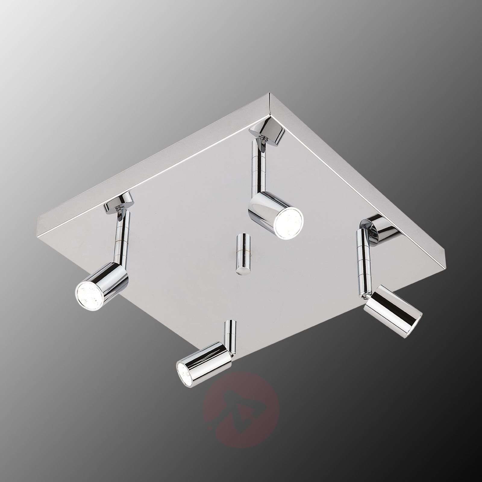 Kwadratowa lampa sufitowa LED Karen z wychylnymi reflektorami Lampa sufitowa LED Karen zdobywa punkty nowoczesnym wyglądem: chromowaną, nowoczesną powierzchnią i zapewnia indywidualne, dostosowane do potrzeb oświetlenie np. w przedpokoju, pokoju dziennym, czy pracowni. Ta komfortowa lampka jest dostarczana wraz z zasilaczem. Emituje światło LED w kolorze ciepłej bieli (2850 K) i dzięki trwałości wynoszącej nawet 50 000 godzin świecenia jest energooszczędną propozycją oświetleniową. Z soczewką 45 stopni. Klasa efektywności energetycznej: A+