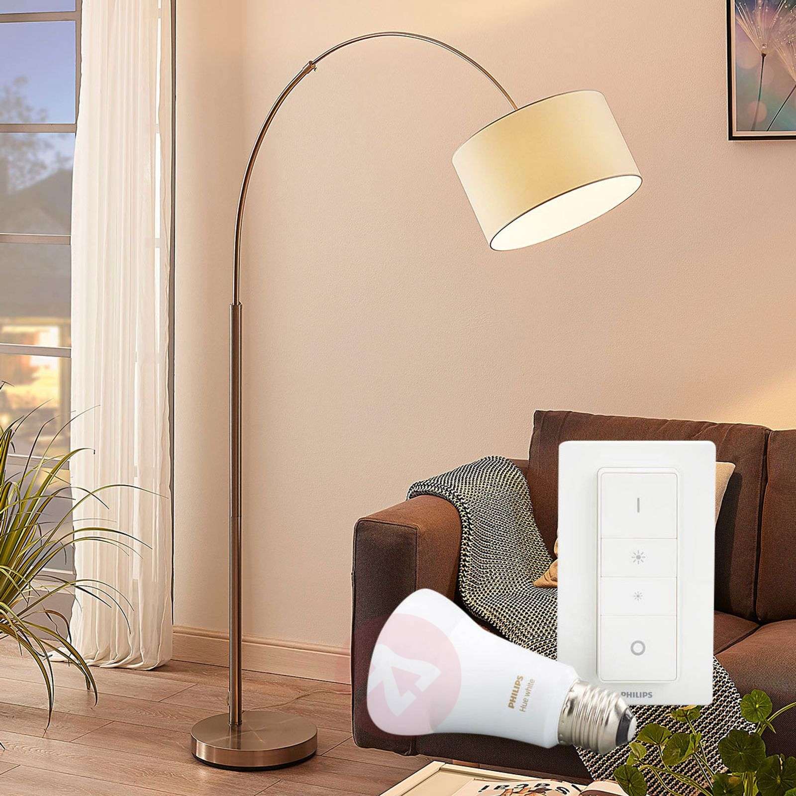 Łukowa lampa stojąca Railyn z żarówką E27 Philips Hue White ze ściemniaczem Nowoczesna stojąca lampa łukowa ma kremowo-biały klosz z tkaniny. Inteligentnie sterowana żarówka LED marki Philips Hue jako źródło światła została dołączona do zestawu promocyjnego. Można nią sterować wraz ze stylową lampą stojącą, albo za pomocą załączonego ściemniacza, przez Bluetooth i pasującą aplikację, albo przez ZigBee i pasujący mostek Hue Bridge. Światło żarówki LED o barwie ciepłej bieli tworzy przyjemną atmosferę, na przykład w domowym salonie. Dołączony ściemniacz może być używany na dwa sposoby: raz jako dodatkowy element sterujący w systemie Hue lub też bez systemu Smart Home jako prosty pilot i przełącznik z ograniczoną funkcjonalnością. Bez systemu Hue i połączenia z mostkiem istnieją trzy podstawowe funkcje, które mogą być obsługiwane za pomocą ściemniacza. Dzięki aplikacji Philips Hue Bluetooth bezpośrednie sterowanie jest możliwe bez dodatkowego mostka za pomocą własnego smartfonu. Lampę stojącą Railyn można łatwo włączać i wyłączać lub bezstopniowo ściemniać. Zasięg Bluetooth podczas użytku wewnętrznego wynosi 10 m. Po połączeniu żarówki Hue z istniejącym systemem Smart Home Philips Hue i połączeniu z odpowiednim mostkiem Hue Bridge, można dokonać dalszych ustawień oprócz przełączania i ściemniania, takich jak wspólne przełączanie różnych lamp w pomieszczeniu lub sterowanie nimi za pomocą głosu poprzez Amazon Alexa, Siri lub Google Home. Cechy szczególne / kompatybilność: - możliwość sterowania za pomocą ściemniacza Hue (dołączony do zestawu) - ściemnianie (za pomocą aplikacji lub ściemniacza) - funkcje ściemniacza: włączanie/wyłączanie/ściemnianie - sterowanie przy użyciu odpowiedniej aplikacji Hue Bluetooth - sterowanie przy użyciu odpowiedniej aplikacji Hue (ZigBee) - kompatybilność z istniejącym systemem Philips Hue - możliwość sterowania głosowego za pośrednictwem Amazon Alexa, Apple HomeKit (Siri) i Google Assistant - kompatybilność z systemami opartymi na technologii ZigBee, takimi jak na przykład Innogy, Bosch, Magenta (Telekom) i Busch-Jäger Wskazówka: do inteligentnego sterowania światłem na bazie ZigBee wymagany jest mostek, taki jak na przykład Philips Hue Bridge (patrz „Akcesoria dodatkowe”). Klasa efektywności energetycznej: A+