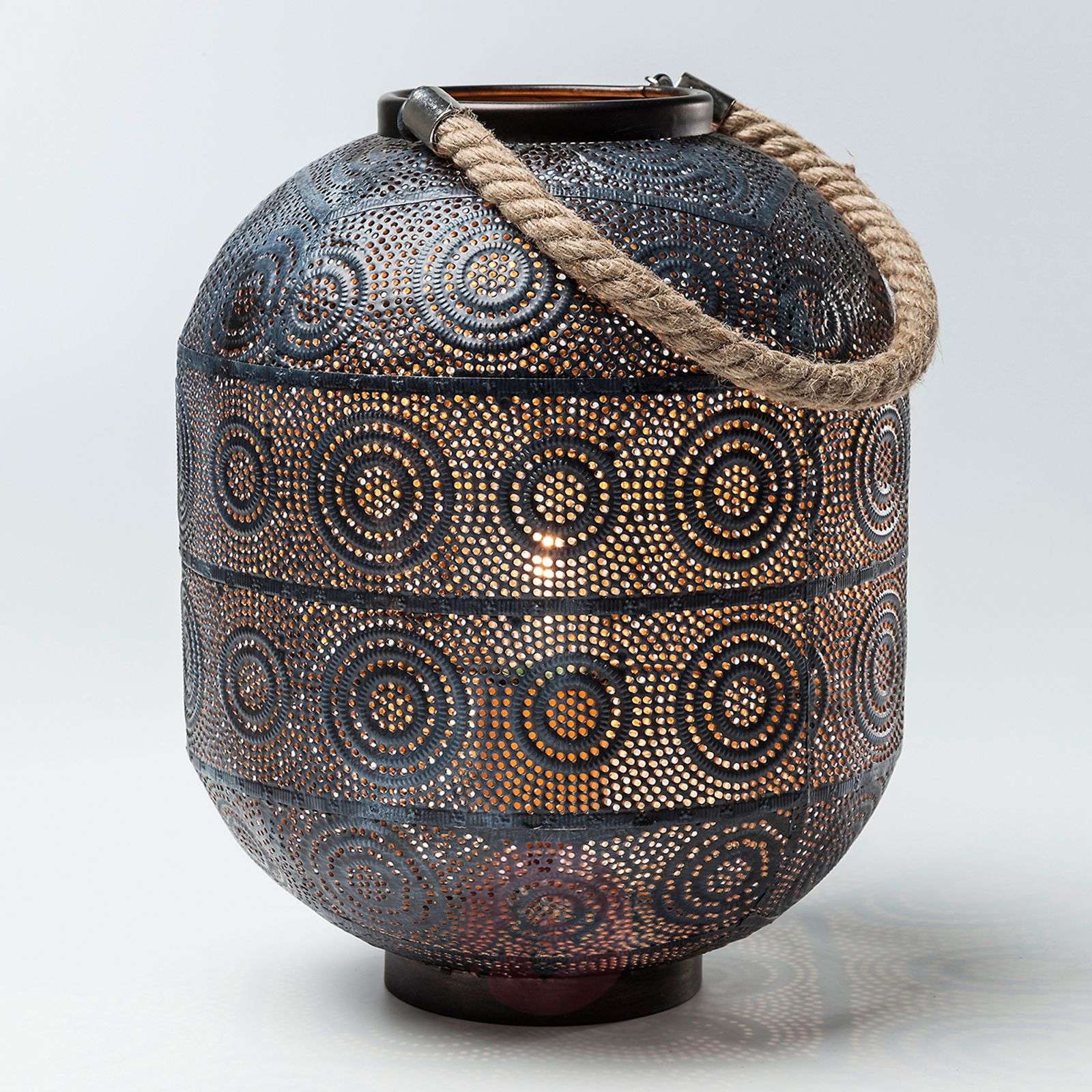Bogata w szczegóły lampa podłogowa Sułtan w kształcie wazonu Lampa podłogowa Sułtan ma szczególnie orientalny wygląd, ponieważ metalowy klosz ozdobiony jest przez czarujący ornament. Wzór jest nie tylko namalowany lub wytłoczony w kloszu, ale ma także postać wzorka z otworów, który wygląda bardzo efektownie, ale również przyczynia się do powstania bardzo nastrojowego światła. Jeśli załączymy źródło światła, znajdujące się wewnątrz lampy, powstaje zapierająca dech w piersiach gra światła i cienia, a wzór, który widzieliśmy wcześniej tylko na obudowie, wydaje się całkowicie wypełniać otoczenie lampy. Sułtan, który przypomina nam wyraźnie wazon, może być użyty jako lampa podłogowa, ponieważ mieści się w pomieszczeniu. Oczywiście można go również postawić podwyższeniu, takim jak na przykład mały stolik dodatkowy czy stylowa komoda. Klasa efektywności energetycznej: A++