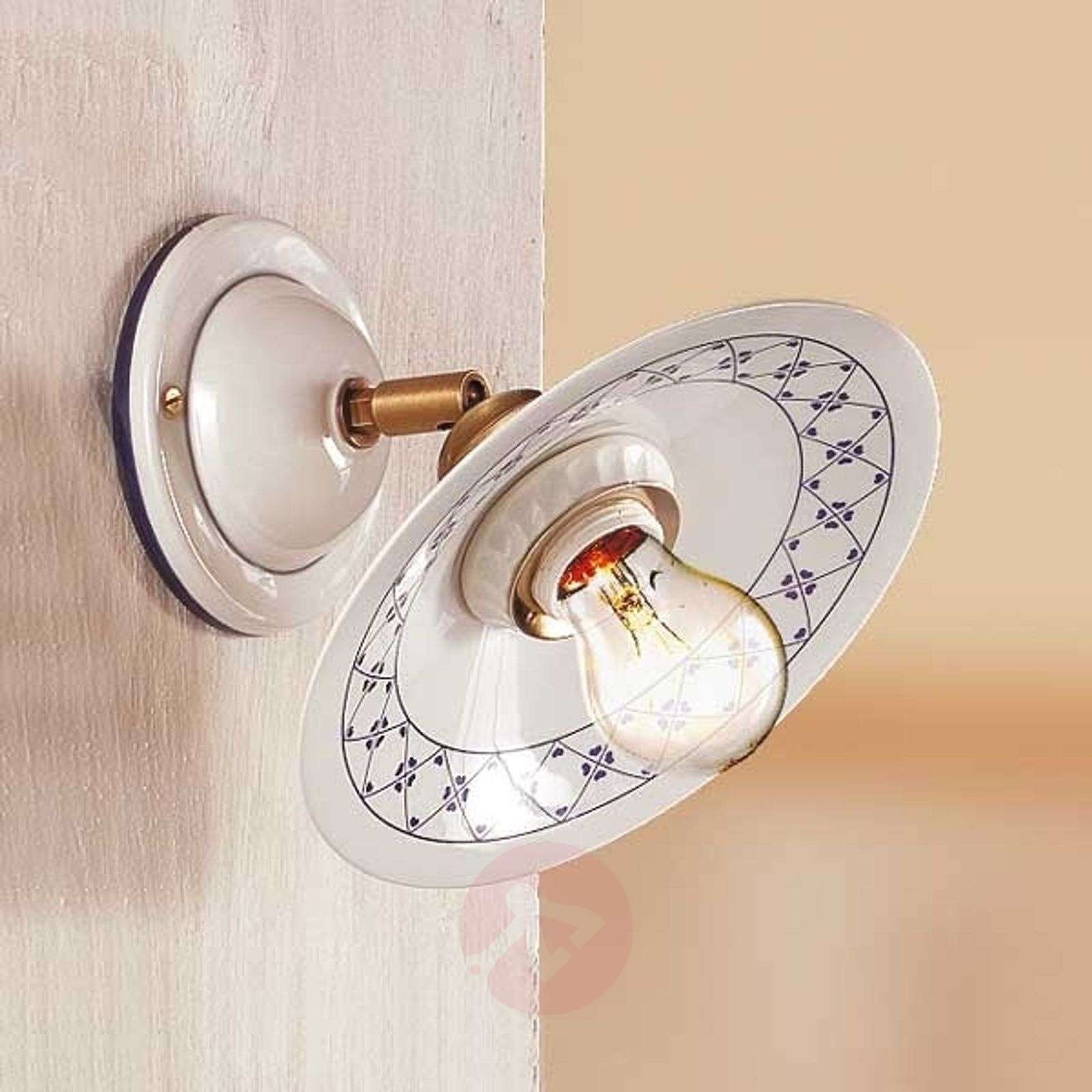 Ceramiczna lampa ścienna CROCIA z ozdobnym wzorkiem w kolorze niebieskim Sielską atmosferę dworku podkreśli lampa ścienna CROCIA, dla której najlepszym tłem będą przejścia i korytarze, sypialnia lub pokój dzienny. Jej płaski, ceramiczny klosz pokryty został białą glazurą. Wzrok przyciąga subtelny wzorek w kolorze niebieskim, zdobiący krawędź klosza. Strumień światła skierowany jest do przodu; można regulować kąta padania światła dzięki wbudowaniu przegubu kulowego w ramieniu lampy. Klasa efektywności energetycznej: A++