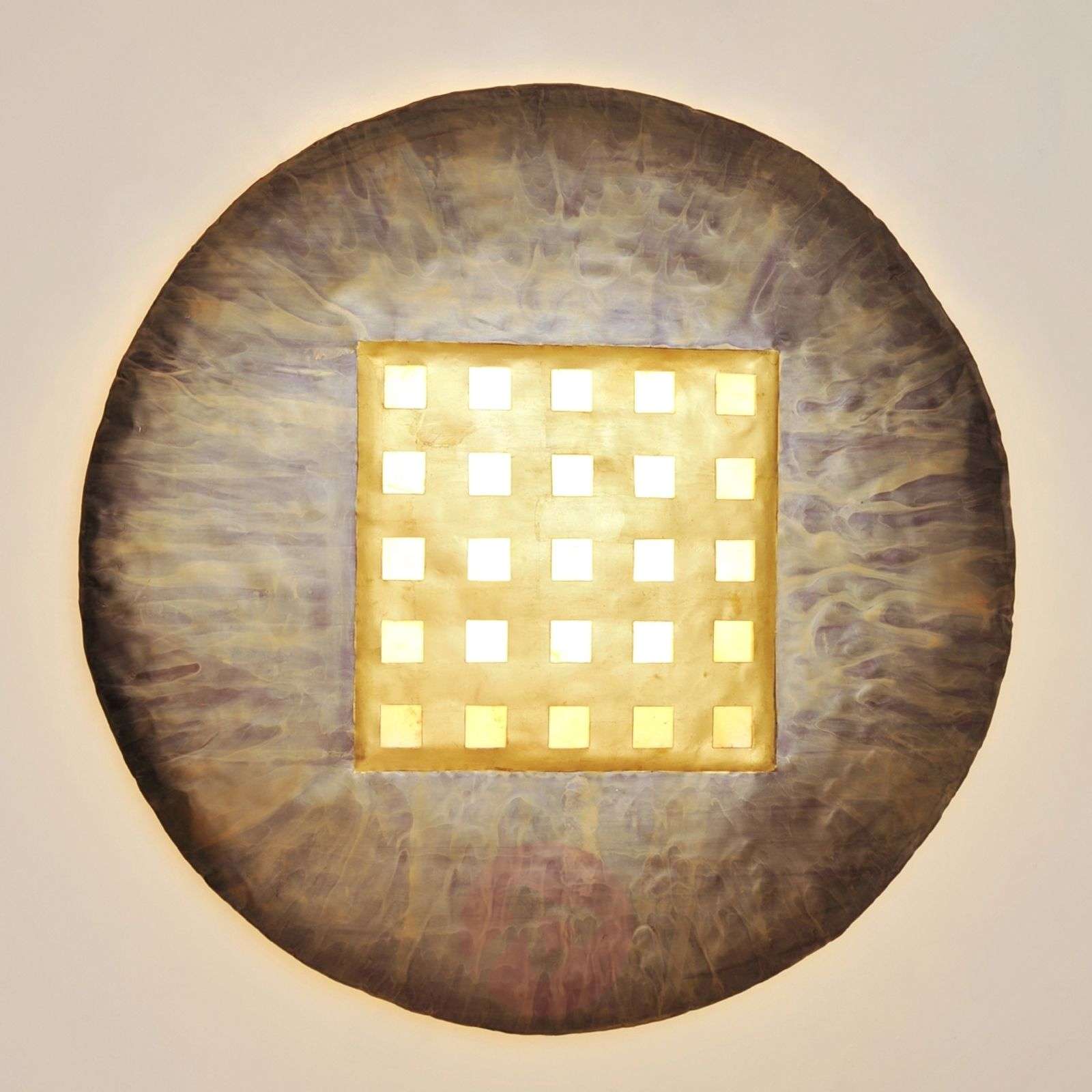 Lampa ścienna DISQUE EXTRA LARGE BRONZE zdobi nowocześnie urządzone wnętrze Okrągła lampa ścienna DISQUE EXTRA LARGE BRONZE z metalu w kolorach złotym, brązowym i czerwieni fascynuje połączeniem wzorów geometrycznych w kształcie kola i kwadratu. Klosz z fiberglasu emituje jasne światło w pomieszczeniu. Klasa efektywności energetycznej: A++