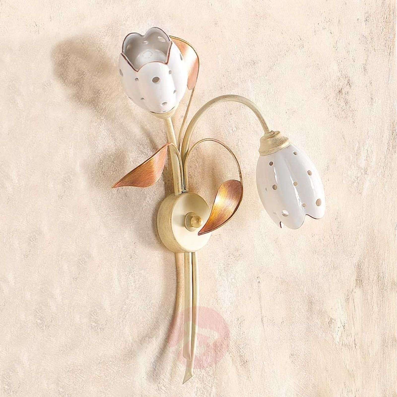 TULIPAO - lampa ścienna w pięknej florystycznej formie TULIPANO to lampa ścienna zachwycająca florystyczną stylistyką. Jej metalową oprawę w kolorze kremowym tworzy bukiet tulipanów, których ceramiczne kielichy pełnią funkcję kloszy. Całość uzupełniają dekoracyjne liście o brązowej barwie. Idealne, zaspokajające estetyczne potrzeby romantyków oświetlenie. Klasa efektywności energetycznej: A++